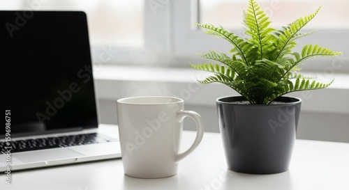 laptop, mug, plant, desk, window, office, workspace, computer, hot drink, tea, cup, indoor, minimalist, modern, white, green, black, grey, fern, pot, table, keyboard, screen, technology, work, home, interior, design, bright, simple, clean, still life, window light, coffee mug, laptop, indoor plant, desktop, personal computer, workplace, potted