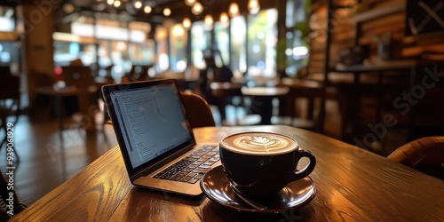 A laptop and a cup of coffee on a wooden table in a cafe.