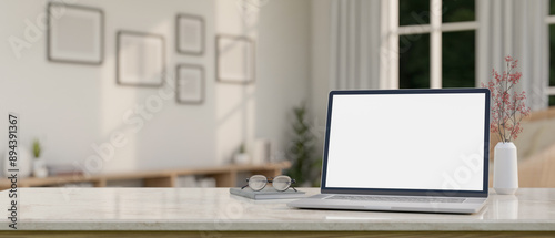 three-dimensional, rendering, illustration, background, interior, design, room, indoor, modern, contemporary, minimal, scandinavian, comfortable, fashionable, trendy, no people, furnished, furniture, architecture, luxury, home, house, apartment, workspace, workplace, table, desk, tabletop, marble, laptop, computer, notebook, template, desktop, display, blank, eyeglass, book, closeup, blurred, bright, daytime, vase, copy space