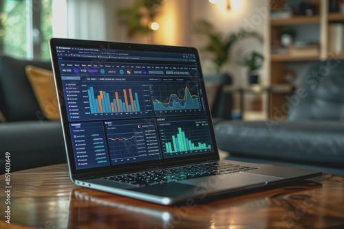 A laptop on a table displays analytics and AI in a first-person perspective in a modern office.