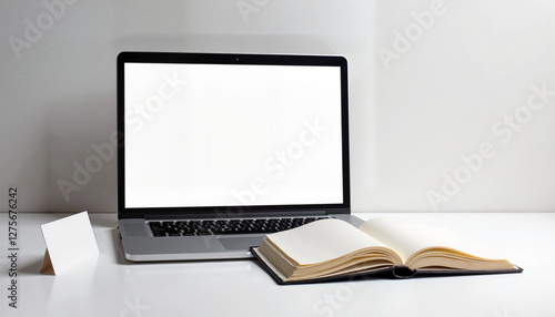 blank screen, open book, branding, workspace, professional, sleek, modern, stylish, clean, template, creative, identity, presentation, marketing, design, minimalistic, office, computer, laptop, technology, monitor, business, screen, cyberspace, keyboard, notebook, desktop, display, digital, communication, book, object, electronic, equipment, tablet, library, blank, information, three-dimensional