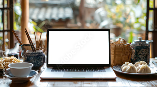 laptop, chinese cuisine, lunch, dish, snack, notebook, workplace, china, cafes, eatery, display, screen, open, computer, monitor, food, breakfast, dinner, delicious, healthy, diet, nourishment, high-calorie, journey, adventure, japan, desktop, keyboard, enjoyment, relaxation, desk, work, blank, communication, technology, empty, white, table