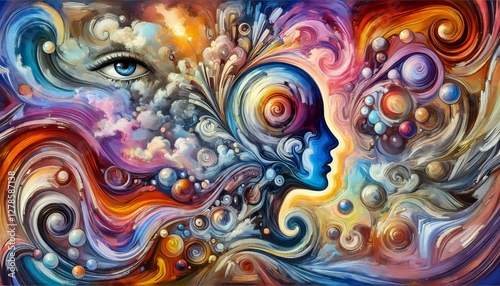 A large abstract digital painting representing ideas and emotions. Vibrant colors swirl together in a dynamic, fluid composition, with elements of light