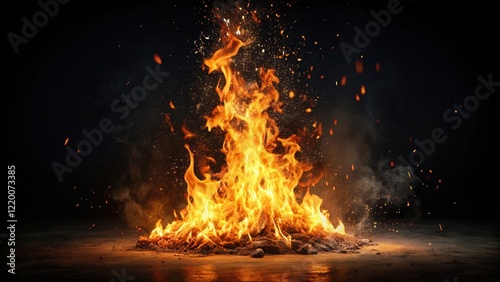 A large blazing fire with flames reaching high into the air, surrounded by dark shadows on a black background, with sparks flying outward in all directions, isolation, blaze