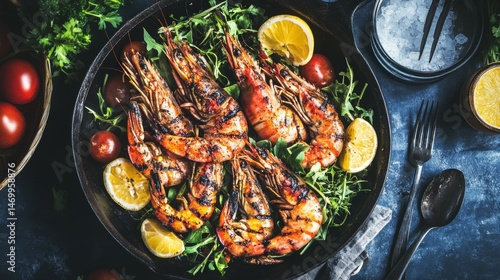 A large bowl of grilled shrimp served with fresh salad greens and vibrant vegetables, creating a healthy and appealing seafood dish.