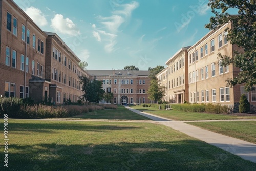 A large building's exterior with a walkway leading up to the entrance, great for architecture or urban planning projects