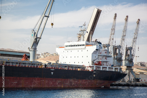 A large cargo ship is waiting for cargo to be loaded in the port. The large white cabin of the ship behind which the loading cranes of the port are visible.