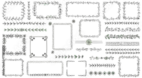 A large collection of hand-drawn botanical frames, borders, and decorative page dividers.