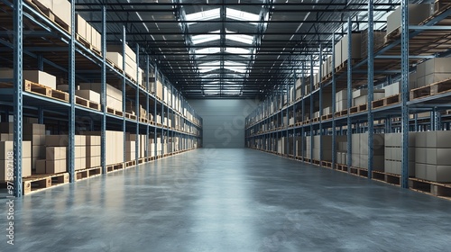 warehouse, shelf, box, empty, storage, distribution, logistic, industrial, building, interior, space, large, floor, concrete, metal, light, ceiling, skylight, factory, manufacture, shipping, freight, export, import, business, commerce, trade, cardboard box, material, inventory, stock, product, good, retail, wholesale, transportation, delivery, movement, economy, industry, work, labor, management, operation