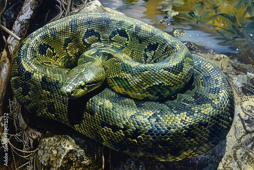 A large green snake sitting on top of a rock. Suitable for nature and wildlife themes