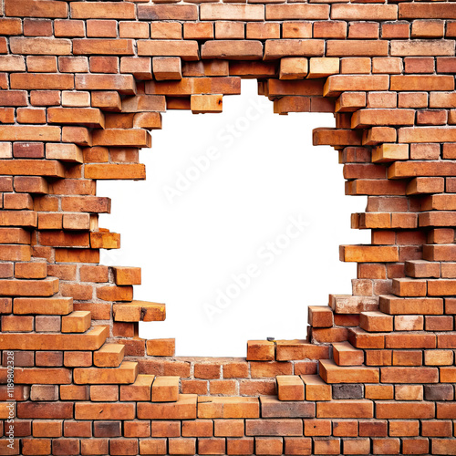 A large hole in a brick wall exposes a dark void showcasing the texture and irregularities of the surrounding bricks and their arrangement