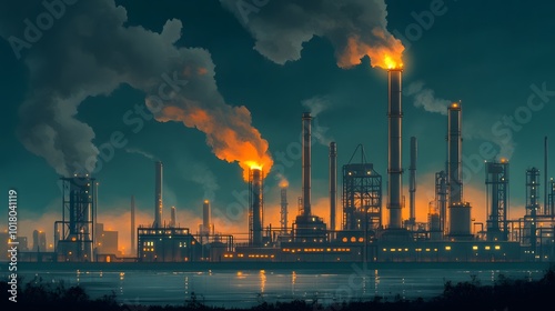 large, industrial, plant, many, tall, smokestack, night, pollution, factory, refinery, billowing, chemical, energy, gas, petrochemical, smoke, technology, ominous, production, oil, metal, sky, power, engineering, dark, chimney, atmosphere, creating, tower, environment, pipeline, chemistry, business, pipe, crude oil, construction, distillery, fuel, steam, gasoline, tube, sunset, gasoline, manufacturing, distillation, light, tank, steel, diesel
