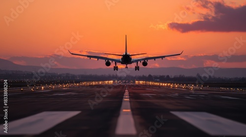 large, jet, flying, runway, sunset, sky, cloud, aeroplane, sun, setting, peaceful, air, arrival, aviation, flight, soaring, serene, aircraft, transportation, plane, airliner, sunrise, background, landing, departure, aerodrome, speed, wing, silhouette, business, trip, dusk, orange, evening, take, tour tourism, twilight, engine, pilot, night, voyage, off, travel, yellow, black, light, horizon, single, gold