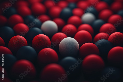A large number of balls in red, white and dark blue colors, arranged as an abstract background.