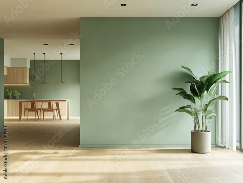 large, open, room, green, wall, potted, plant, corner, interior, home, kitchen, modern, dining, design, area, table, chair, apartment, white, house, furniture, style, wood, living, space, wooden, lamp, flat, floor, window, decor, indoor, loft, empty, bright, comfortable, concept, sofa, light, grey, contemporary, parquet, background, cosy, architecture, inside, new, render, illustration