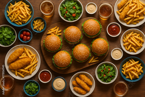 A large overhead view of a diverse food spread, featuring multiple plates of burgers, french fries, and various dipping sauces, with side dishes of salads and drinks