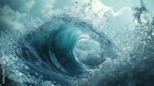 A large, powerful wave crashes in the ocean, creating a beautiful and dramatic scene.