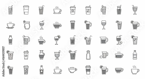 drink, beverage, icon, set, collection, hot drink, tea, juice, water, wine, cocktail, soda, liquid, refreshment, cup, mug, glasses, bottle, pitcher, jug, hot, cold, steam, ice, lemon, straw, lid, take-away, cafes, bar, eatery, menu, graphic, illustration, doodle, vignetting, hand-drawn, line, art, outline, simple, minimal, minimalist, design, element, vector, pictogram, symbol
