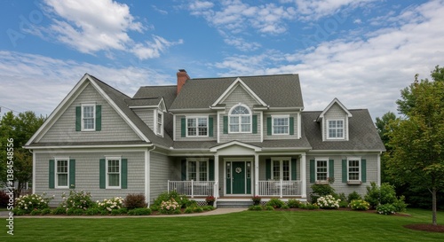 house, sky, cloud, lawn, tree, siding, shutter, window, roof, grass, exterior, architecture, home, estate, property, yard, residence, building, facades, dormer, chimney, white, green, grey, porch, flower, garden, daytime, country, suburban