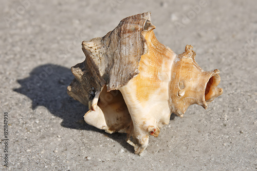 A large, weathered conch shell rests on a textured concrete surface, casting a distinct shadow.