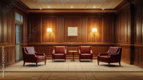 A legislative hall with wood-paneled walls and plush chairs. Featuring tradition and comfort