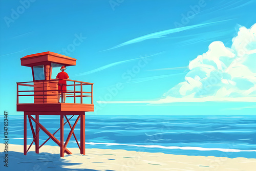 lifeguard, tower, beach, ocean, sand, sky, cloud, water, coast, seascape, summer, vacation, red, illustration, art, sea, shore, coastal, sunny, day, relaxation, tranquil, horizon, safety, guard, observation, person