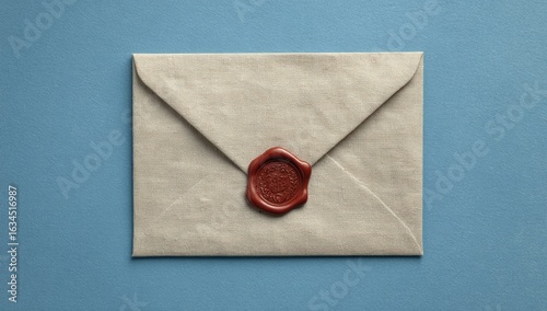envelope, wax, seal, red, beige, letter, mail, vintage, antique, sealed, document, paper, folded, craft, communication, message, stamped, ancient, formal, important, historic, correspondence, old, classic, history, detail, light, colours, smooth, texture, simple, design, object, surface, blue, background, isolated, flat, neutral, detail, closeup, photo, image, still life