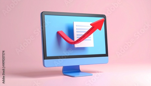 computer, desktop, monitor, screen, document, paper, arrow, upward, growth, progress, increase, red, blue, pink, background, minimalist, design, three-dimensional, rendering, illustration, technology, digital, datum, business, productivity, success, development, improvement, trend, chart, graph, statistic, information, rise, elevation, advancement, expansion, gain, promoting, surge, climb, ascent, upgrade, jump, leap, lift, incline, escalation
