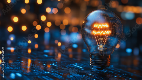 A light bulb is floating in a blue background. The light bulb is surrounded by a blurry, glowing background. Concept of mystery and intrigue, as the light bulb seems to be floating in mid-air
