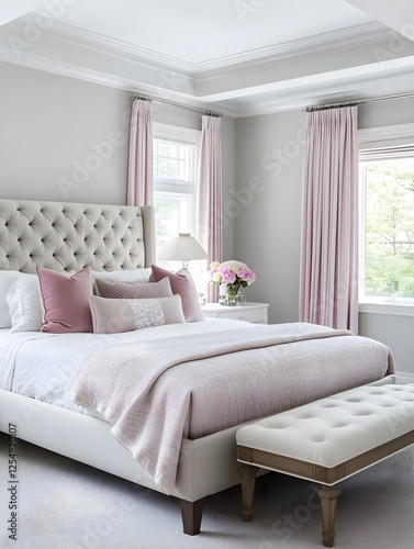 bedchamber, cosy, furniture, reddening, design, pastel, white, light, interior, space, home, grey, room, background, wall, soft, bed, decoration, blanket, up, living, mock, modern, neutral, empty, table, cushion, plant, decor, elegant, house, minimal, apartment, style, vase, wooden, scandinavian, hotel, lamp, headboard, door, three-dimensional, roomy, rug, beige, carpet, pink