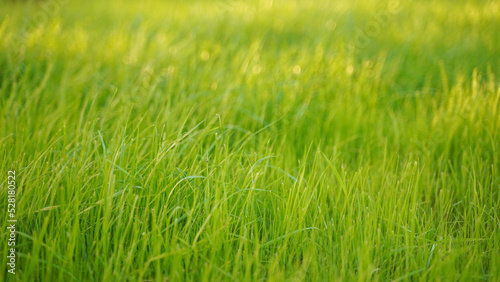 a light green young grass lawn is illuminated by the sun