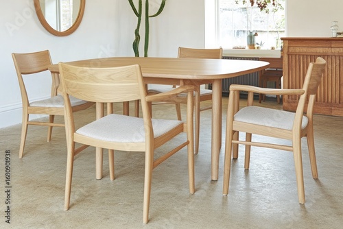 light, wood, dining, table, chair, armchair, oval, top, solid, oak, furniture, cactus, plant, round, mirror, wall, corner, cabinet, modern, minimal, interior, arrangement, decor, stylish, contemporary, clean, elegant, roomy, living, room, home, lifestyle, comfortable, seating, design, setup, natural, texture, background, composition, aesthetic