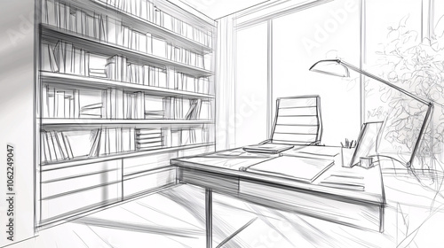 A line art sketch of a modern office space with a large desk, ergonomic chair, and shelves full of books, bathed in natural light.