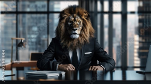 lion, business, executive, black suit, attaching, desk, office, tower block, skyscraper, city landscape, professional, corporate, power, animal, powerful, leadership, serious, formal, workspace, city view, window, modern, majestic, confident, meeting, negotiation, urban, workplace