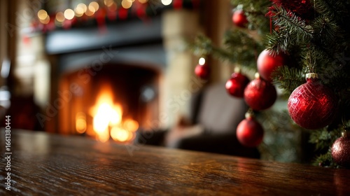 a little christmas tree adorned with red ornaments standing on a wooden desk by an open chimney