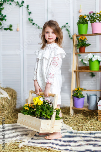 A little girl in a white dress holding beautiful flowers