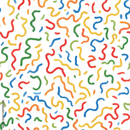 A lively arrangement of squiggly lines in multiple colors creates a dynamic design. The pattern features red, blue, green, yellow, and orange lines over a white background, enhancing visual interest.