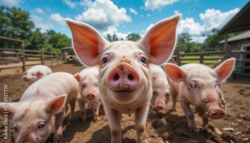 A lively gathering of adorable piglets curiously wandering around a farmyard, their playful nature evident as they interact with one another under bright, sunny skies