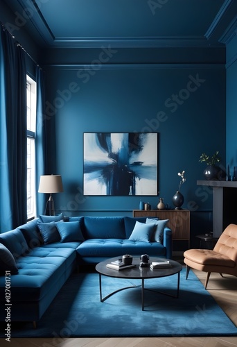 A living room with a blue couch, a coffee table, and a painting on the wall