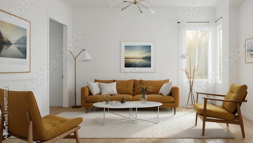 A living room with a modern sense.(home) A view with a sofa and a frame, with an autumn atmosphere, and a neat picture of the interior of the apartment. Generative AI