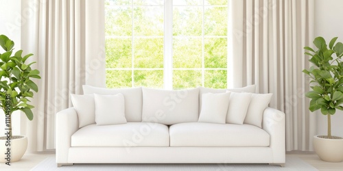 a living room with white sofa, plant vase and windows with curtains on background