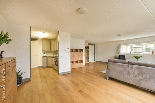 a living room with wood flooring and white walls in the center of the room is an open kitchen area