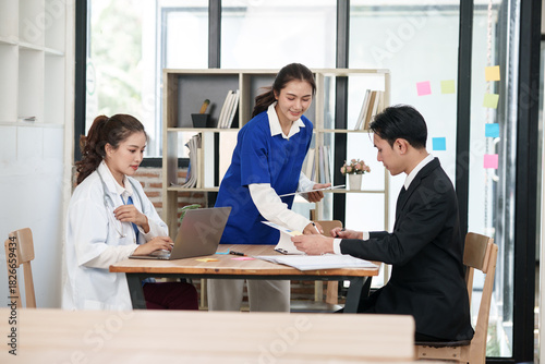 hospital, meeting, business meeting, doctor, teamwork, computer, businessperson, planning, real people, professional occupation, business, administrator, discussion, talking, working, occupation, businessman, technology, man, people, businesswoman, indoor, laptop, doctors office, surgeon, woman, office, manager, leadership, employee, nurse, director, communication, learning, document