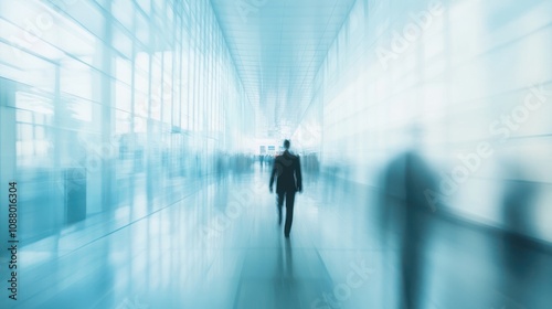 business, office, corridor, hallway, businessman, man, suit, walking, journey, success, future, achievement, ambition, motivation, career, professional, corporate, modern, architecture, design, light, bright, white, blue, glasses, window, blur, motion, abstract, city, urban, work, lifestyle, people, crowd, group, team, leadership, management
