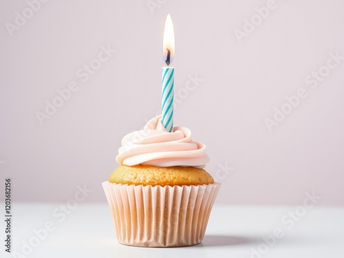 A lone candle on a pastel-colored birthday cupcake, celebration treat, happy birthday, solo candle