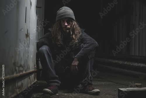 clothing, person, footwear, human face, ground, street, dark, woman, man, sitting, urban, shadow, perspective, loneliness, contrast, contemplation, worn-out, fatigue, isolation, asphalt, curve, city landscape, duality, resilience, vulnerability, determination, coldness, empty, angular, desolation, emptiness, mystery, anonymity, adversity, hopelessness, elegance, monochrome, solitude