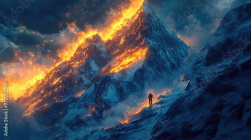 mountain, peak, fire, flames, sky, cloud, storm, hiker, silhouette, nature, landscape, wilderness, adventure, travel, exploration, journey, challenge, danger, hope, faith, spiritual, mystical, surreal, abstract, art, digital artwork, illustration, graphic, design, fantasy, imagination, dream, dramatic, awe, beauty, power, energy, light, darkness, contrast, composition, perspective, depth, texture