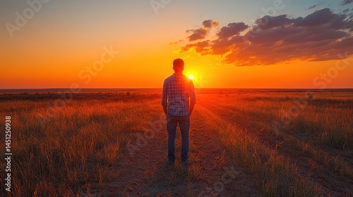 A lone figure standing on a dirt path at sunset, surrounded by tall grass and a colorful sky
