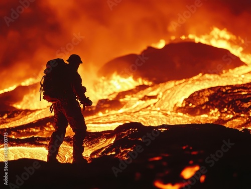 A lone figure stands before a flowing lava landscape, illuminated by the intense glow of molten rock, highlighting nature's power and beauty.