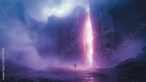 landscape, mystical, chasm, fog, figure, glow, nature, surreal, adventure, exploration, fantasy, light, atmosphere, scenery, majestic, beauty, mystery, travel, solitude, calm, serenity, dramatic, colours, shadow, depth, horizon, surrealism, wonder, escape, calmness, aethereal, sky, emotion, environment, peace, imagination, inspiration, dreamlike, vision, awe, captivating, breathtaking, enchanting, cinematic, mythical, phenomena, journey, discovery, magic